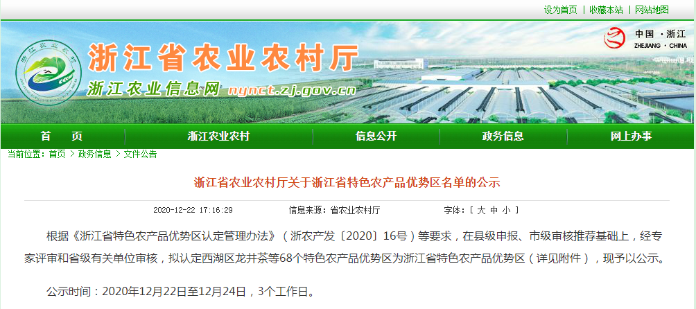 根據(jù)《浙江省特色農(nóng)產(chǎn)品優(yōu)勢區(qū)認(rèn)定管理辦法》(浙農(nóng)產(chǎn)發(fā)〔2020〕16號)等要求,在縣級申報(bào)、市級審核推薦基礎(chǔ)上,經(jīng)專家評審和省級有關(guān)單位審核,擬認(rèn)定西湖區(qū)龍井茶......