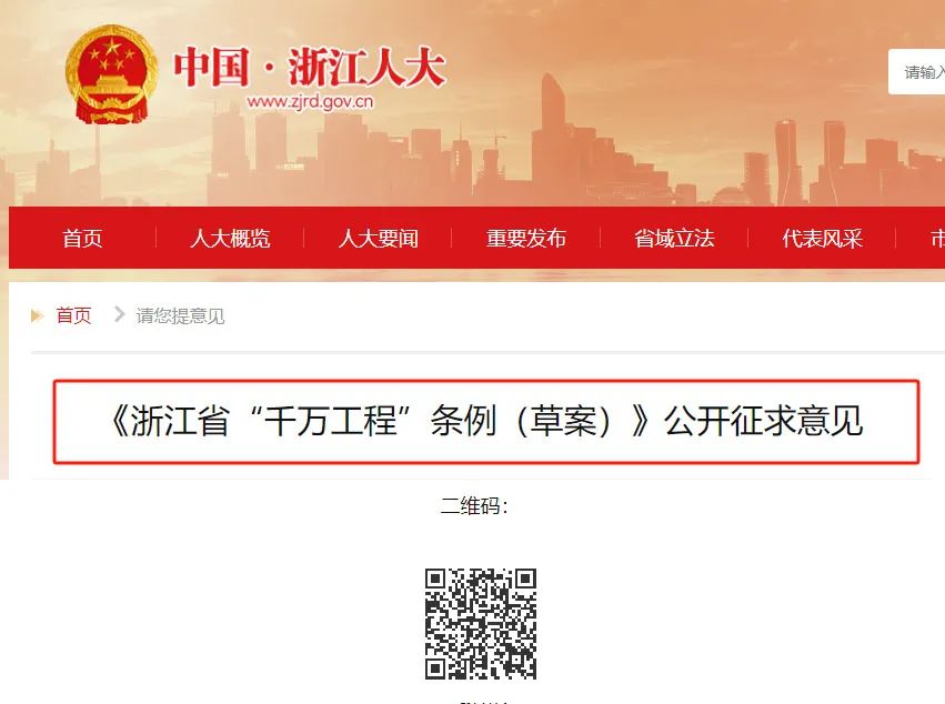 《浙江省“千萬工程”條例(草案)》已經(jīng)省十四屆人大常委會第十一次會議審議。現(xiàn)將草案和說明予以公布。社會公眾可以掃描二維碼將意見反饋至省人大常委會法工委。意見征集......