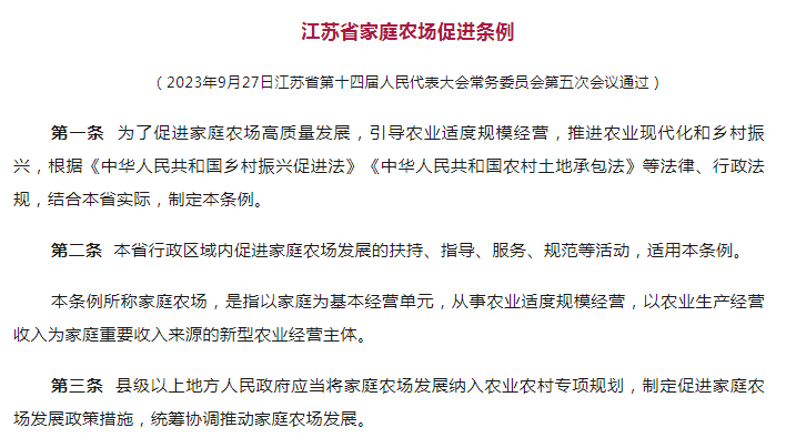 第一條 為了促進家庭農場高質量發展,引導農業適度規模經營,推進農業現代化和鄉村振興,根據《中華人民共和國鄉村振興促進法》《中華人民共和國農村土地承包法》等法律......