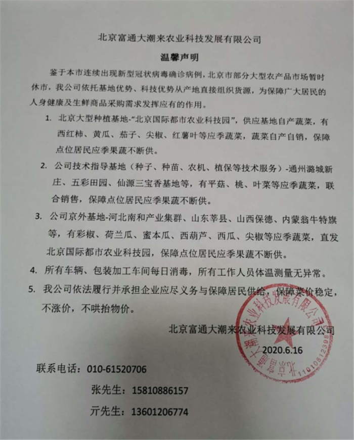 ▼在北京農產品市突發疫情后,北京富通大潮來農業科技發展有限公司(簡稱 富通大潮來)依托基地優勢、科技優勢從產地直接組織貨源,為保障廣大居民的人身健康及生鮮商品采購需求發揮應有的作用。應對非常時期民生需求,全力以赴穩價格、保供應。富通大潮來從基地點對點對接 70 余個社區,疫情期間,減少污染接觸環節,保證市民菜價。