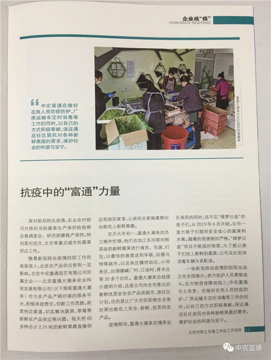 ▼《北京市院士專家工作站工作動態》抗疫專刊 — 抗疫中的“富通”力量。文中記載了中農富通在做好在崗人員防疫防護、廠房運輸車定時消毒等工作的同時,以自己的方式積極奉獻,保證滿足社區居民對各種新鮮果蔬的需求,維護社會的和諧與安寧。