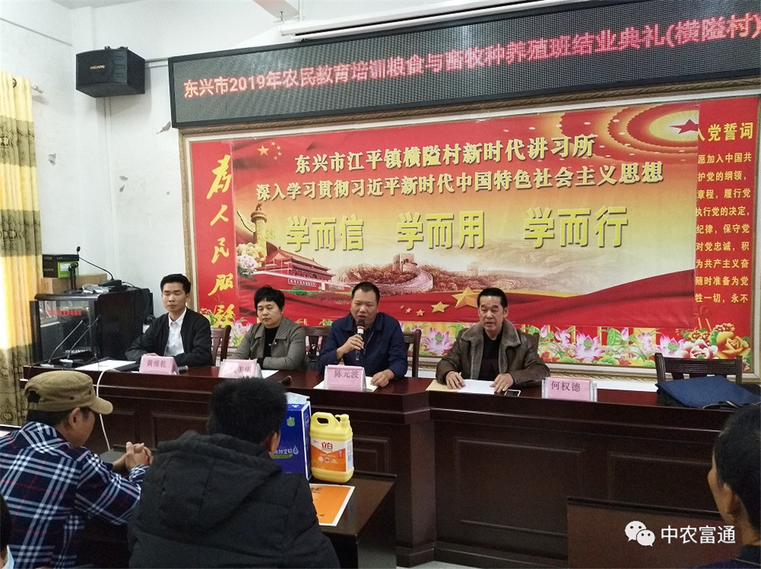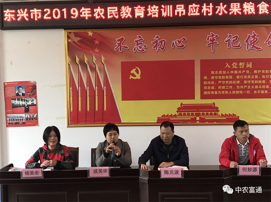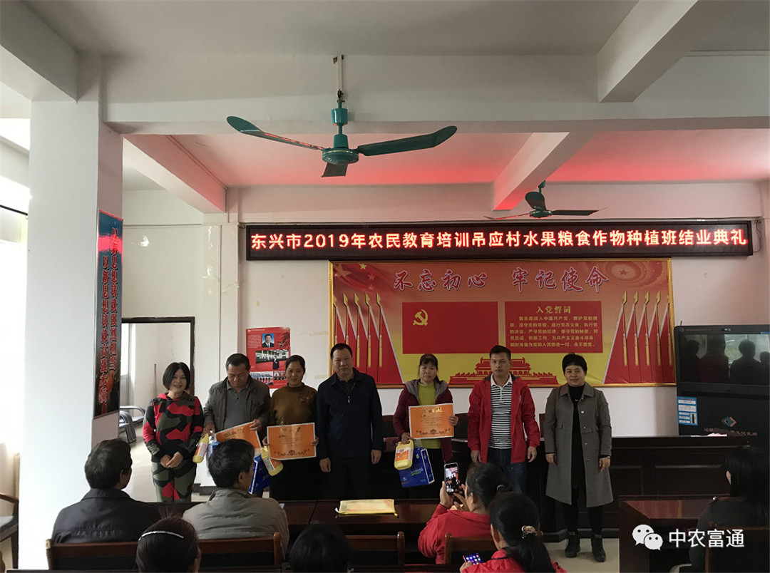 ▼12月23日,由中農富玉承辦的東興市2019年農民教育培訓吊應村水果糧食作物種植班結業典禮舉行,東興市農業農村水利局副局長陳元波、主任成美華、吊應村第一書記何妙源參加結業典禮。