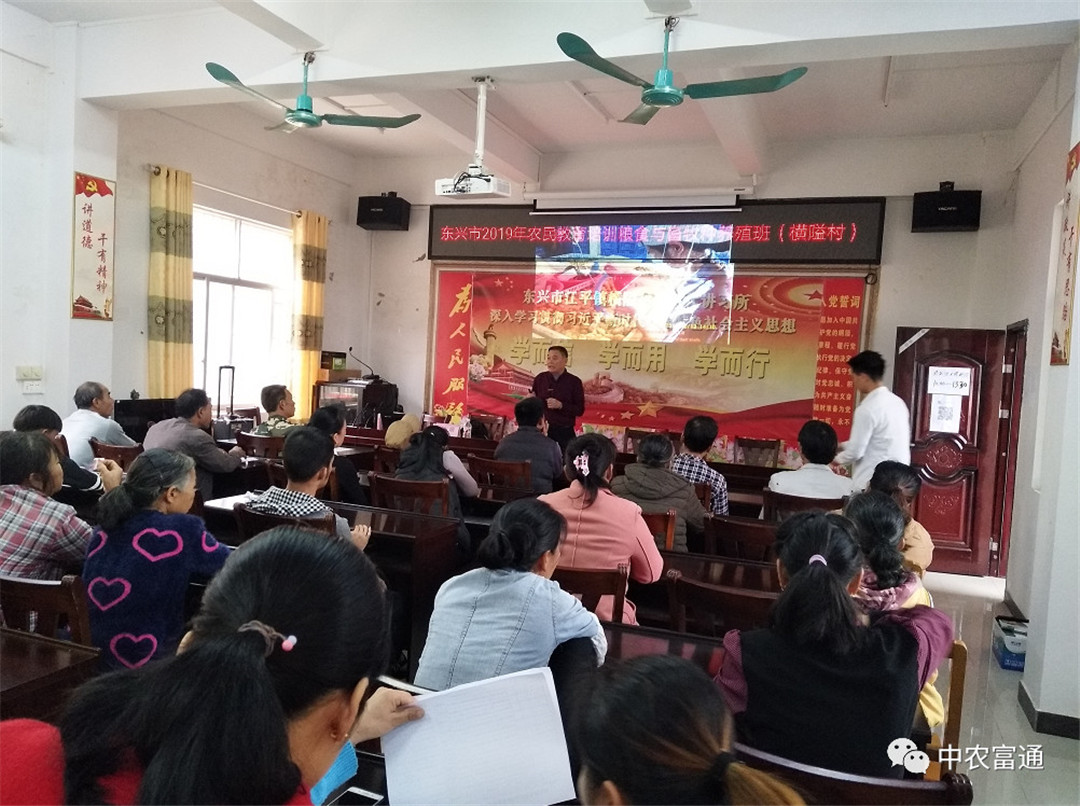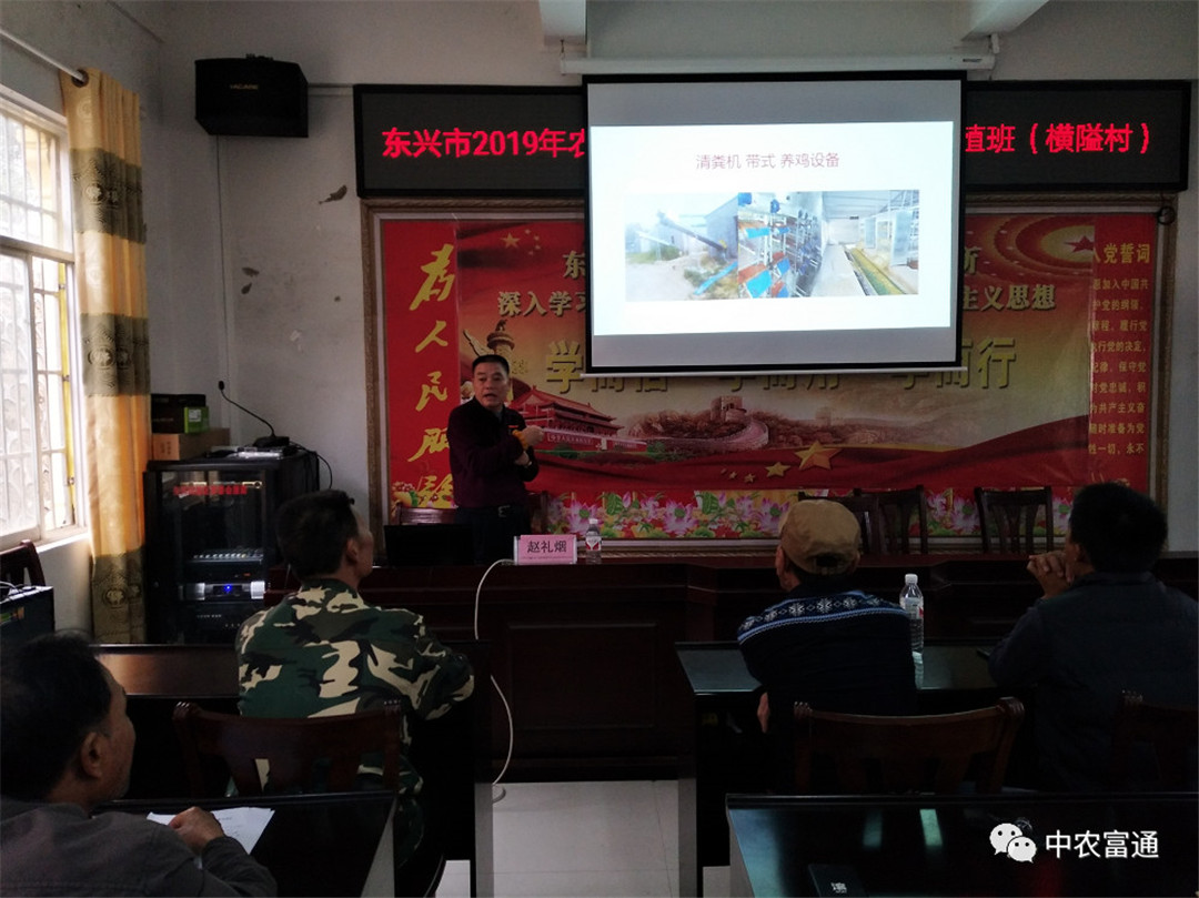 ▼12月開始,東興市2019年農民教育培訓橫隘村糧食與畜牧種養殖班在中農富玉開班。下圖為廣西農業職業技術學院趙禮煙老師給學員們授課《家禽飼養與管理》課程。