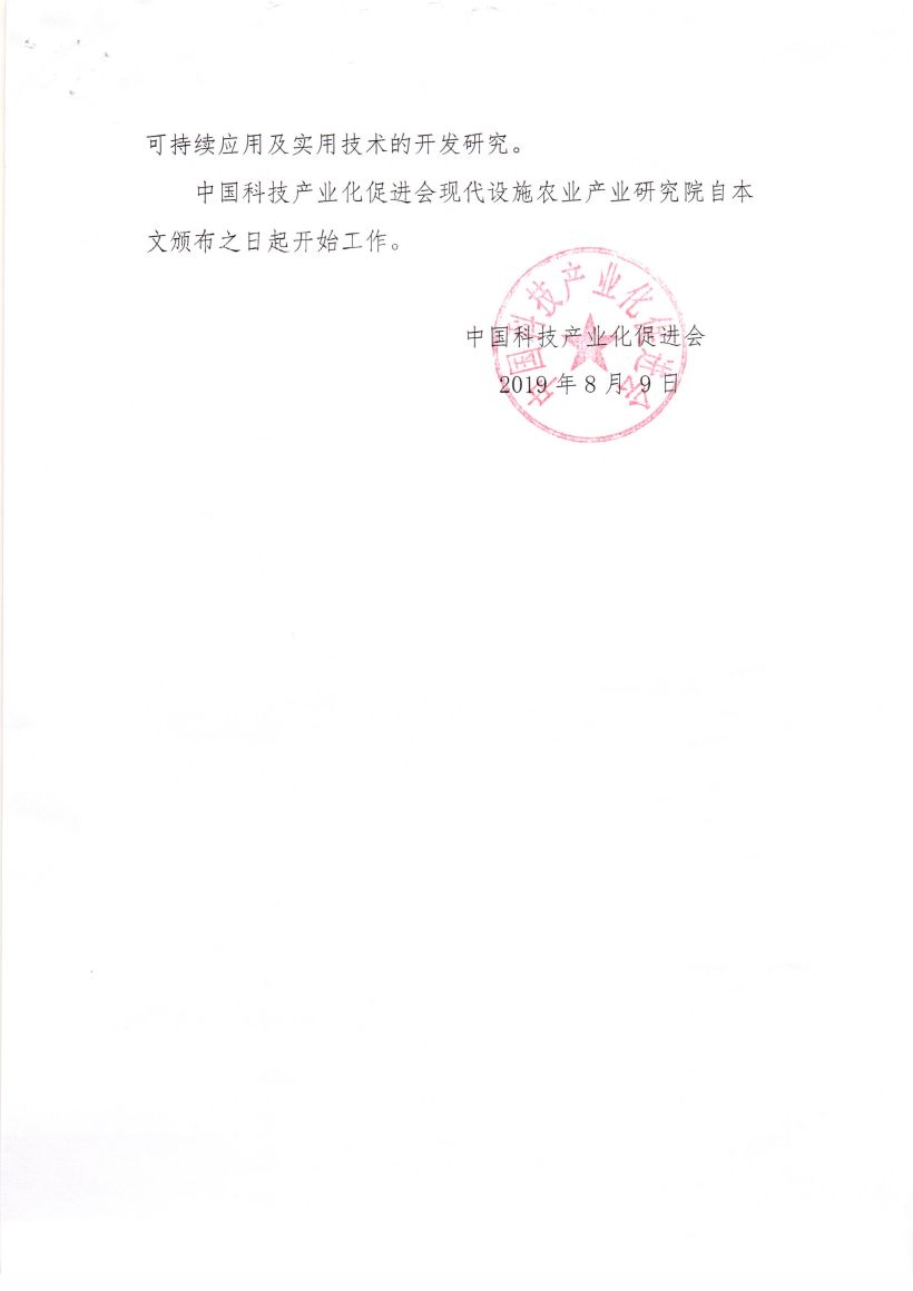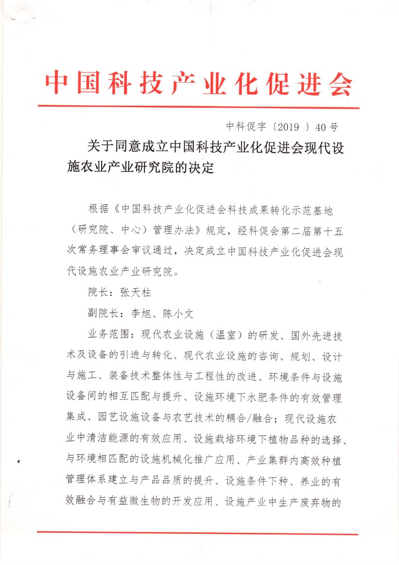 2019年8月9日,中國科技產業化促進會公布了關于同意北京中農富通園藝有限公司(簡稱中農富通)成立“中國科技產業化促進會現代設施農業產業研究院”的決定。任命中國農業大學農業規劃科學研究所所長、設施農業產業國際合作聯盟理事長張天柱為研究院院長,任命中農富通園區發展事業部總經理李旭、技術創新事業部總經理陳小文為副院長。