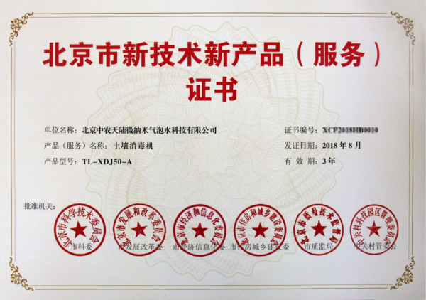 2018年8月,北京中農(nóng)天陸微納米氣泡水科技有限公司(簡稱 中農(nóng)天陸)自主研發(fā)的“土壤消毒機”通過北京市新技術(shù)新產(chǎn)品(服務(wù))認證。截止到目前,中農(nóng)天陸公司共有四個產(chǎn)品通過北京市新技術(shù)新產(chǎn)品(服務(wù))認證。