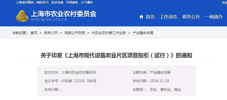各涉農區人民政府,各有關單位:??為高質量推進現代設施農業片區建設,提高現代設施農業項目質量和水平,經市政府同意,現將《上海市現代設施農業片區項目指引(試行)》......