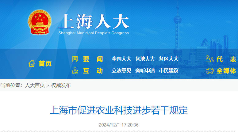 上海市人民代表大會常務委員會公告《上海市促進農業科技進步若干規定》已由上海市第十六屆人民代表大會常務委員會第十七次會議于2024年11月28日修訂通過,現予公布......