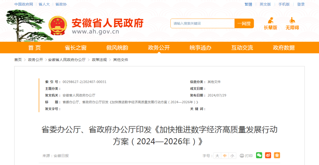 近期,中共安徽省委辦公廳、安徽省人民政府辦公廳印發了《加快推進數字經濟高質量發展行動方案(2024-2026年)》,并發出通知,要求各地各部門結合實際認真貫徹落......