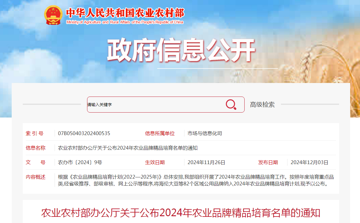 按照《農業農村部辦公廳關于開展2024年農業品牌精品培育工作的通知》要求,經省級推薦、形式審查、專家推選等程序,共有82個農業品牌納入2024年農業品牌精品培育......