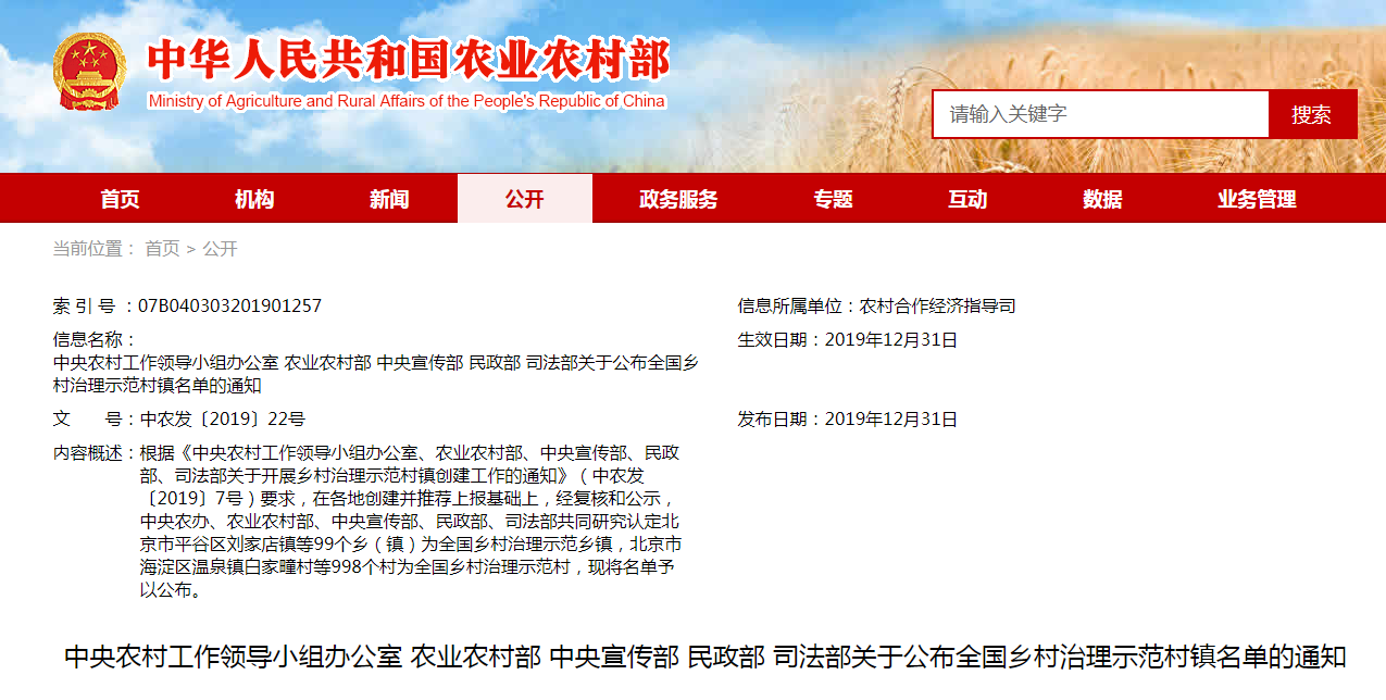 為貫徹落實中央關于推進鄉村治理體系與治理能力現代化的決策部署,發揮典型經驗的示范引領作用,根據《中央農村工作領導小組辦公室、農業農村部、中央宣傳部、民政部、司法......
