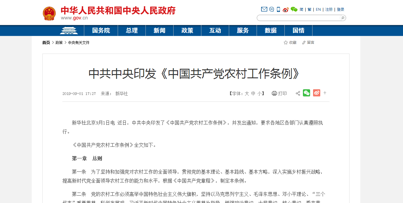 新華社北京9月1日電 近日,中共中央印發(fā)了《中國(guó)共產(chǎn)黨農(nóng)村工作條例》,并發(fā)出通知,要求各地區(qū)各部門認(rèn)真遵照?qǐng)?zhí)行。...