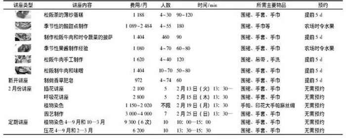 課程講座內(nèi)容富有特色且細(xì)致系統(tǒng), 具有一定的理論深度。上課時(shí)間和頻率都較為固定, 有助于培養(yǎng)市民對現(xiàn)代農(nóng)業(yè)公園的依賴感和歸屬感。公園官方網(wǎng)站上也會及時(shí)更新每月講座預(yù)告, 并詳細(xì)介紹講座內(nèi)容、時(shí)間、地點(diǎn)、限定人數(shù) (部分需要預(yù)約) 和費(fèi)用 (分為會員費(fèi)用和非會員費(fèi)用, 表格中的費(fèi)用為日元円) 以及補(bǔ)充說明需要準(zhǔn)備的材料及適合聽講的人群年齡段等非常詳細(xì)的信息。